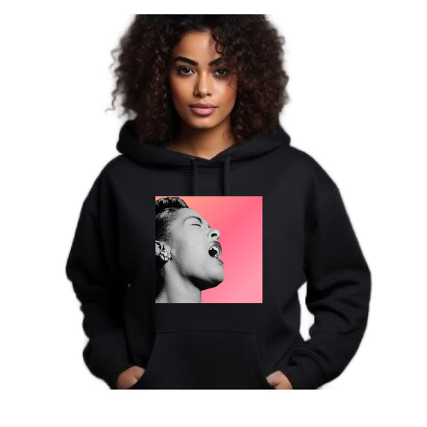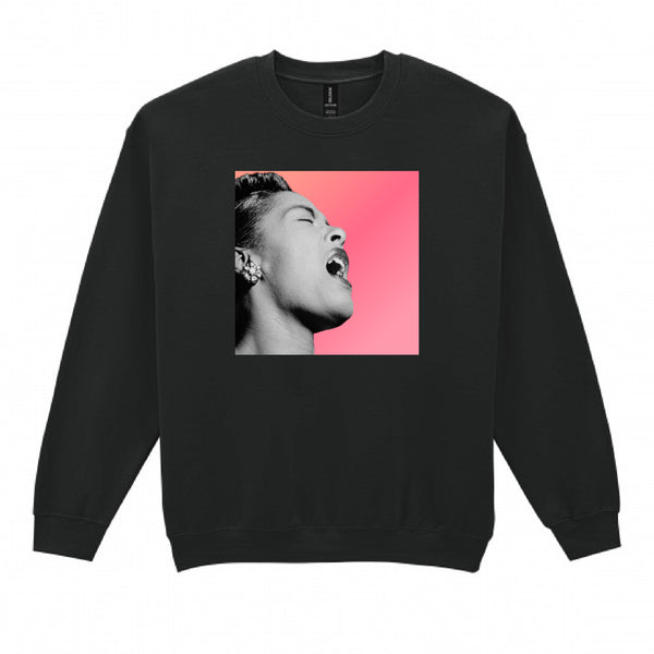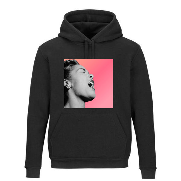 Honoring "Ladybird" Billie Holiday this head turning design features an off-center jumbo print of the idol inset onto a vibrant pink ombré box or majestically floating.